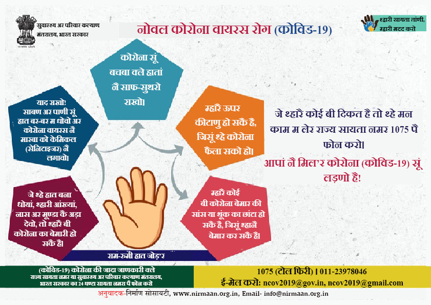 याद राखो! साबण अर पाणी सूं हात बर-बर म धोवो अर कोरोना वायरस नै मारबा को केमिकल (सेनिटाइजर) नै लगावो।