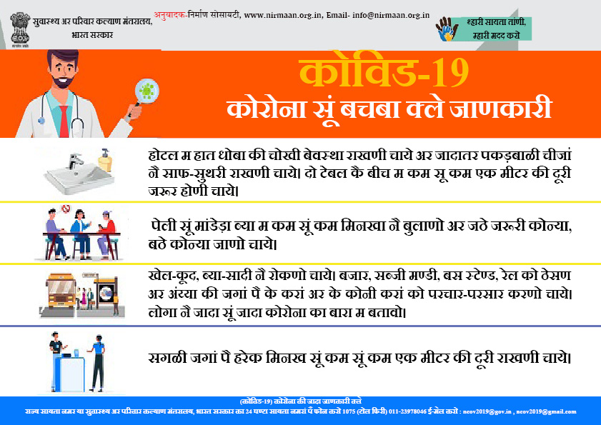 खेल-कूद, ब्या-सादी नै रोकणो चाये। बजार, सब्जी मण्डी, बस स्टेण्ड, रेल को ठेसण अर अंय्या की जगां पै के करां अर के कोनी करां को परचार-परसार करणो चाये। लोगा नै जादा सूं जादा कोरोना का बारा म बतावो।