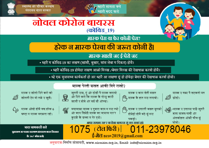 - खुदगी नास, मूं अर ठोडी पै मास्क लगावो अर निगे करो कि मास्क कै दोन्यू कानी खाली न होवे अर सई सी आज्या।